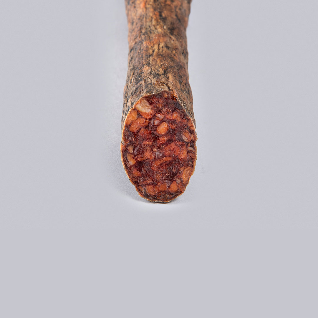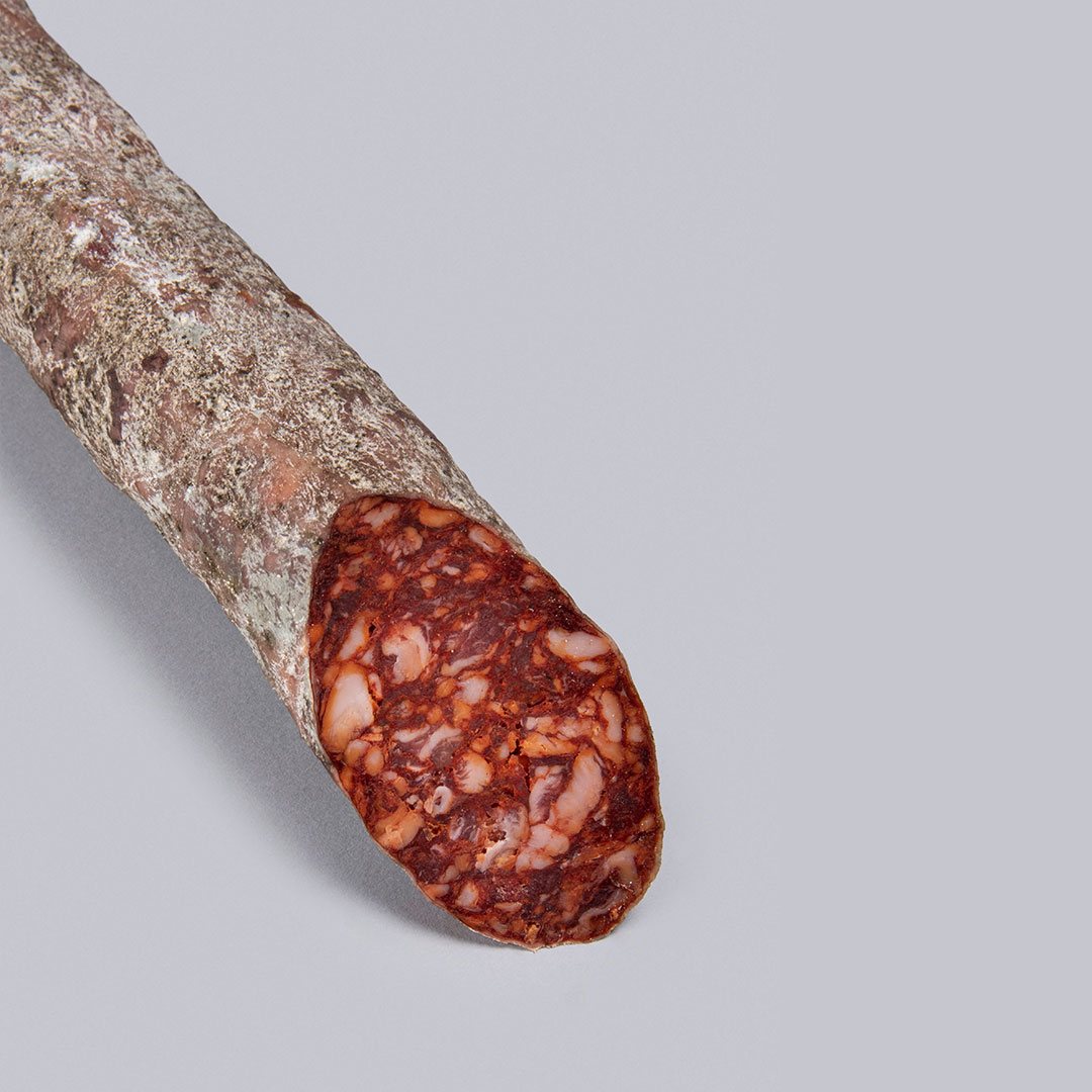Ce Chorizo Cular de Bellota est le résultat d'un élevage minutieux de porcs ibériques avec une alimentation 100 % naturelle, principalement composée d'herbes sauvages et de glands, ce qui lui confère sa saveur unique et sa texture délicate.