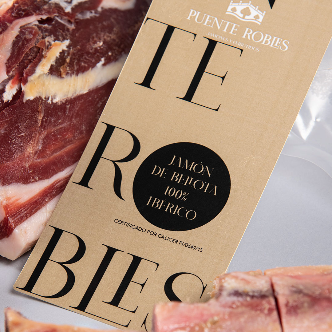 Ce jambon 100 % ibérique est le fruit d'un élevage minutieux de porcs ibériques nourris principalement de céréales et de glands, ce qui lui confère une saveur unique et une texture délicate.