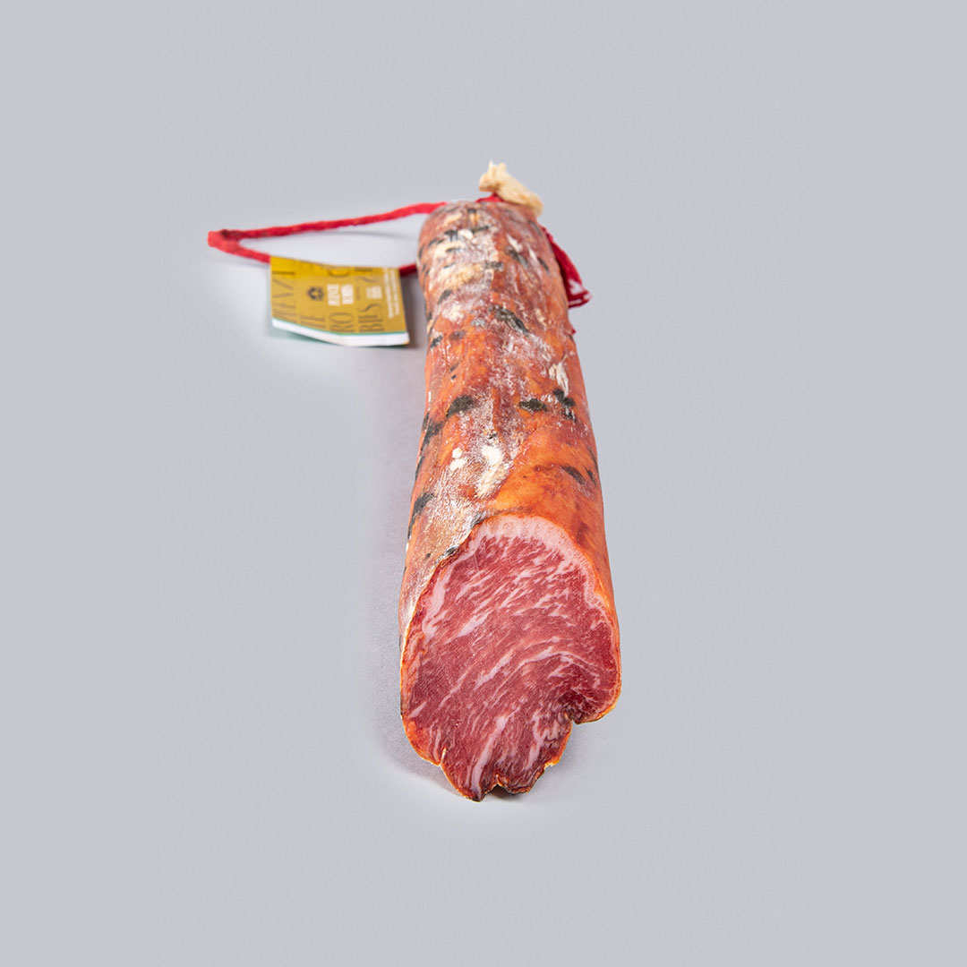 Lomo de Cebo de Campo 50% race ibérique, paprika, sel commun, épices naturelles, conservateurs (E252 nitrate de potassium et E250 nitrate de sodium), antioxydants (E301 ascorbate de sodium), boyau de type fibrant.