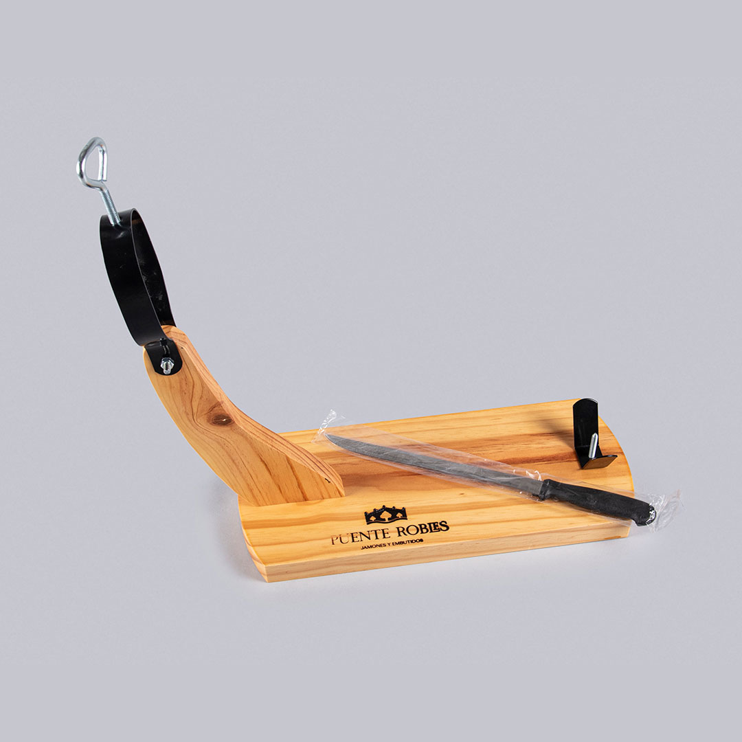 Élégance et fonctionnalité pour la planche à jambon modèle Gondola, personnalisée par Puente Robles. Elle comprend également un couteau de haute qualité.